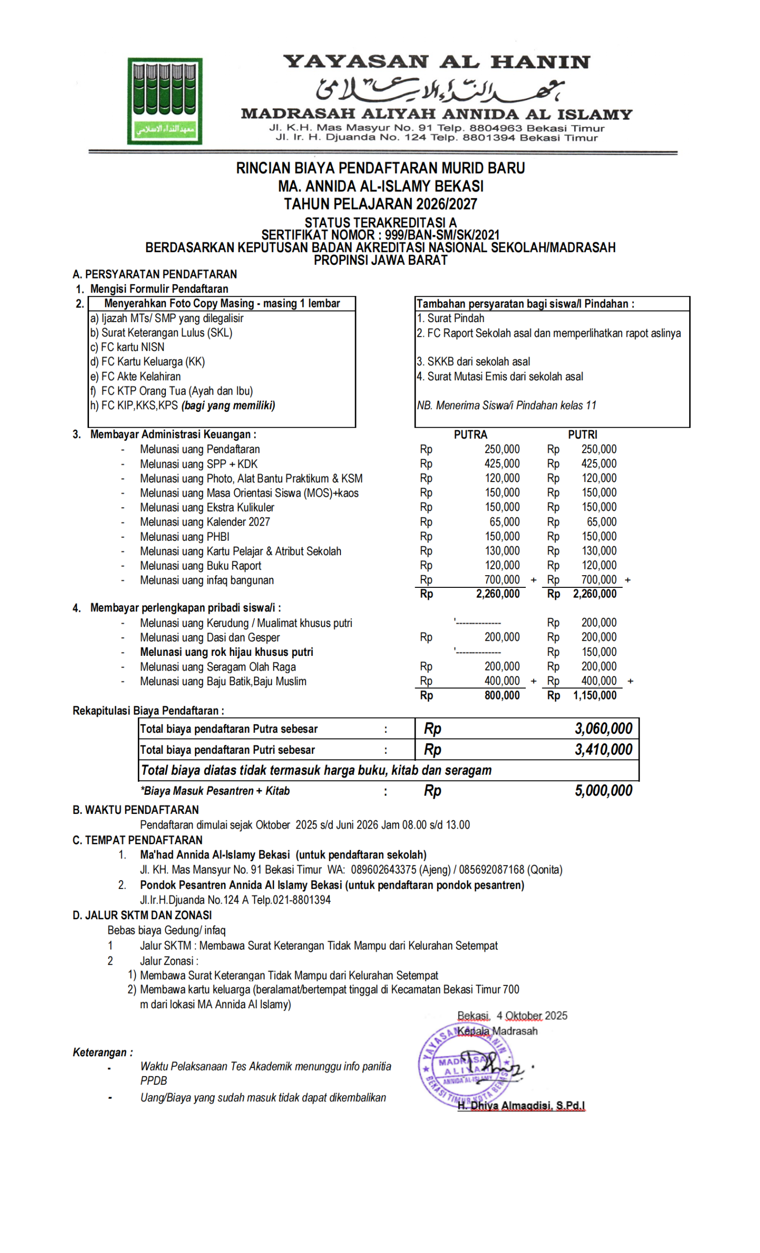 | * Putra | : Total biaya pendaftaran sebesar | Rp. 3.060.000 (Tidak termasuk harga buku & kitab) | |